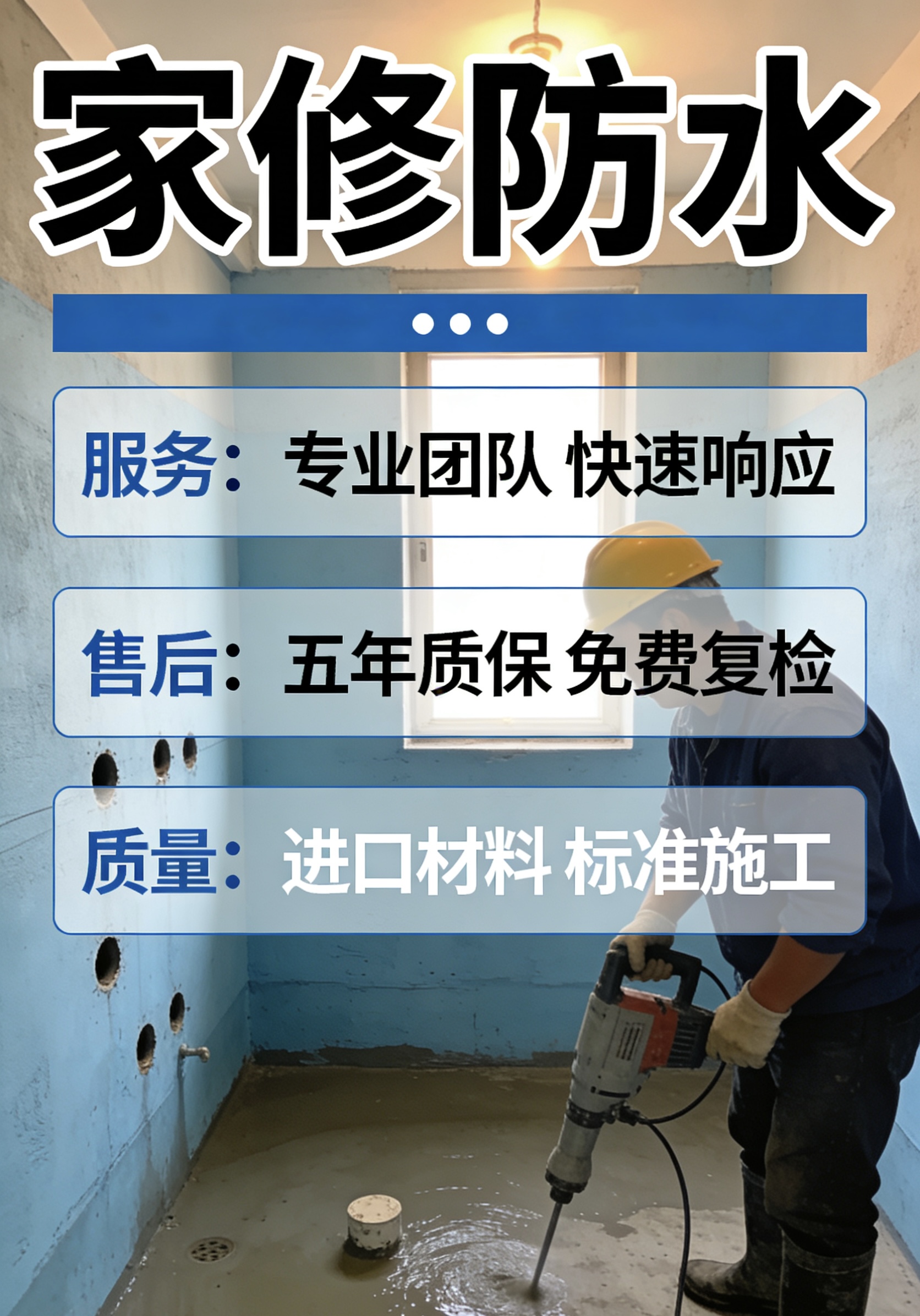 业主可以通过线上一键预约家修防水服务,操作便捷。下单后,师傅会在15分钟内电话确认,并在2小时内到达现场进行免费上门检测。检测采用红外热成像仪,30分钟内出具电子版《渗漏风险报告》,漏点、成因、方案一目了然。施工过程全程标准化操作,完工后还会进行3次闭水试验,确保解决漏水问题,不留任何隐患。施工后出具《防水质保合同》,核心区域质保5年,相较行业平均3年质保延长67%;质保期内每年免费上门检测1次,建立专属施工档案,材料与工艺全程可追溯。